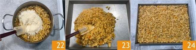 Mezclad bien 22, luego trasladad la pasta y patatas a una bandeja 24 distribuyéndola por toda la superficie 24. Meted la bandeja en la nevera.
