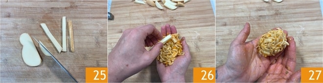 Mientras tanto, cortad la scamorza en tiras 25. Pasado el tiempo de enfriamiento, mojad las manos y tomad una porción de pasta y patatas aplastándola ligeramente en la palma, luego añadid la scamorza 26 y selladla en el interior para formar los supplí 27; con estas cantidades deberíais obtener unos 20.