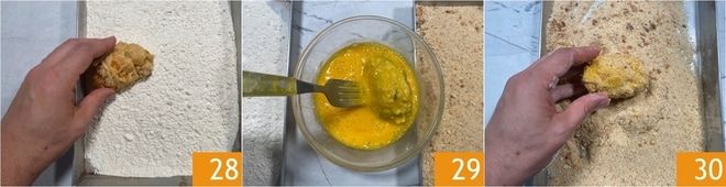 Después de haber formado todos los supplí, estáis listos para el empanado: pasad los supplí primero por la harina 28, luego por los huevos batidos 29 y finalmente por la mezcla de pan rallado fino y rústico 30.