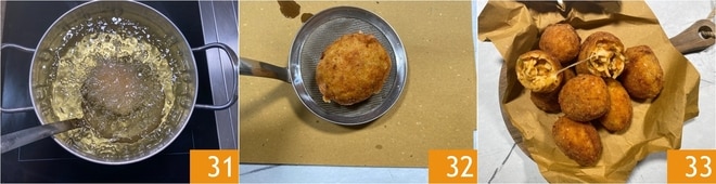 Calentad el aceite de semillas a 160° y freíd 1-2 supplí a la vez durante unos 4 minutos 31. Cuando estén bien dorados, escurridlos en papel para fritos 32. ¡Vuestros supplí de pasta y patatas están listos, servidlos aún calientes 33!