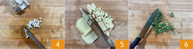 También cortad en cubos el tocino 4. Pelad las patatas y cortadlas en cubos de la misma medida 5. Finalmente, picad finamente el romero 6.
