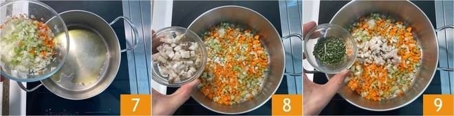 Calentad el aceite en una cazuela amplia, luego añadid el picado de verduras 7, el tocino 8 y el romero 9.
