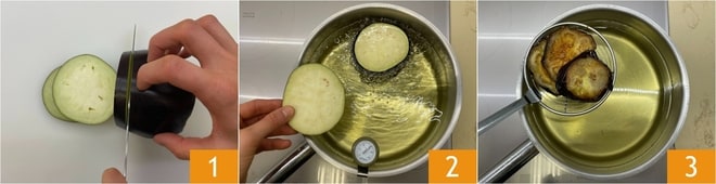 Para preparar los tacos de berenjenas, primero corte los extremos de la berenjena y córtela en rodajas de aproximadamente 1 cm de grosor 1. Caliente el aceite de semillas hasta una temperatura de 170°-175°, sumerja 2-3 rodajas de berenjenas a la vez 2 y fríalas hasta que estén doradas 3. Escúrralas sobre papel absorbente y reserve.