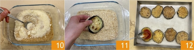 Mezcle para integrar todo 10, después pase las berenjenas fritas por la mezcla, asegurándose de cubrir ambos lados 11. Coloque las berenjenas en una bandeja forrada con papel de horno y distribuya una cucharadita de salsa de tomate 12.