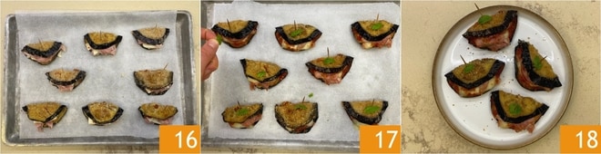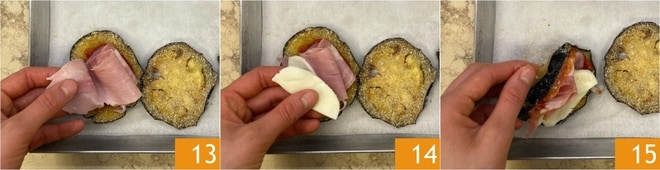 Añada una loncha de jamón 13 y una de mozzarella 14. Doble la berenjena por la mitad y fíjela con un palillo 15.