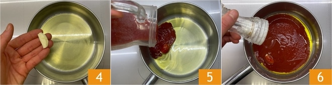 Ahora prepare la salsa: en un cazo, añada un chorrito de aceite con un diente de ajo 4, luego vierta el puré de tomate 5 y sazone con sal 6.