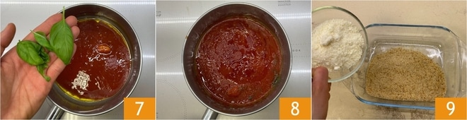 Aromatice con algunas hojas de albahaca 7, mezcle y cocine a fuego medio-bajo durante 5-10 minutos 8. Mientras tanto, corte la mozzarella en rodajas, luego prepare el empanado vertiendo el pan rallado y el Parmesano en una fuente 9.