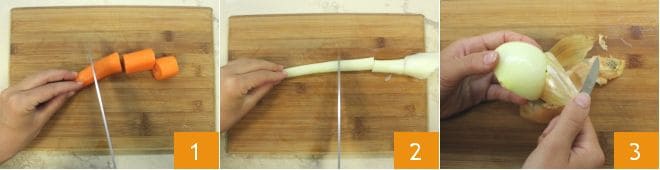 Para preparar la tajine de cordero con ciruelas y almendras con cuscús aromático, comienza con el caldo vegetal: llena una olla grande de agua, añade sal y lleva a ebullición, luego pela las zanahorias con un pelador y córtalas en trozos 1. Continúa pelando el tallo de apio y cortándolo en trozos 2. Luego pela una cebolla 3 y córtala en cuartos.