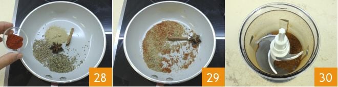 Por último, añade el chile en polvo 28 y tuesta a fuego alto durante aproximadamente 2 minutos, justo el tiempo para que las especias liberen sus aromas 29. Luego deja enfriar la mezcla de especias y transfiérela a un mezclador, enciéndelo durante unos segundos 30 y reserva.