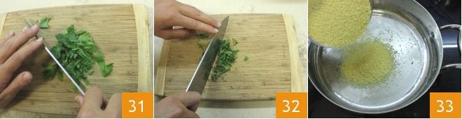 Ahora prepara la mezcla de especias frescas: enjuaga bajo agua corriente el perejil fresco y pícalo finamente 31, realiza la misma operación con las hojas de menta, lávalas y pícalas 32. Luego unta con mantequilla una olla ancha con bordes altos y vierte el cuscús precocido 33, extendiéndolo para que no se superponga demasiado.