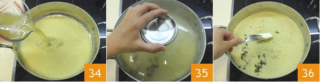 Añade gradualmente aproximadamente 300 ml de caldo 34, mezclando con un tenedor. Cubre y deja reposar durante 10 minutos, el tiempo que se hinche 35. Pasado este tiempo, añade 20 gr de mantequilla y desmenuza el cuscús con los dientes de un tenedor 36.