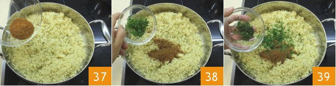 Vierte la mezcla de especias molidas 37, el perejil y la menta picados (38-39).