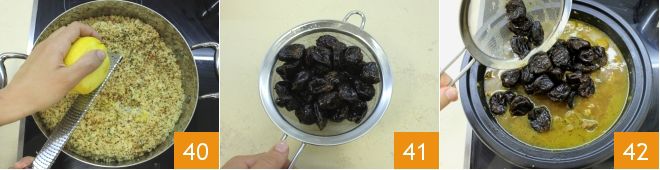 Ralla la ralladura de un limón 40 y mezcla bien para integrar todo. Deja reposar el cuscús cubierto, hasta que la tajine esté lista para servir. Ahora escurre las ciruelas del zumo de naranja con un colador 41 y agrégalas al cordero 42.