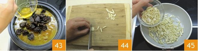 Añade la miel milflores 43, que refuerza la nota agridulce y deja cocer durante otros 20 minutos. Alternativamente, puedes sustituir la miel con azúcar moreno. Mientras tanto, coloca las almendras enteras peladas sobre una tabla de cortar y córtalas en filetes 44, luego transfiere las almendras fileteadas a una sartén antiadherente 45 y tuéstalas a fuego moderado, hasta que se doren, teniendo cuidado de no quemarlas.