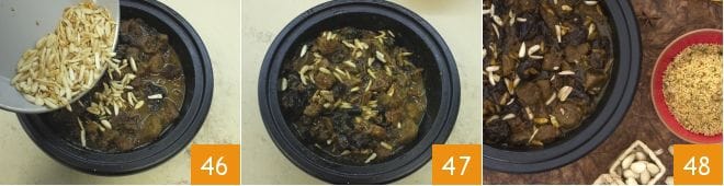 En este punto, añade las almendras a la mezcla de cordero, ciruelas y especias 46 y mezcla para integrar todo 47. ¡Solo te queda servir inmediatamente la tajine de cordero con ciruelas y almendras acompañándola con el cuscús aromático 48!
