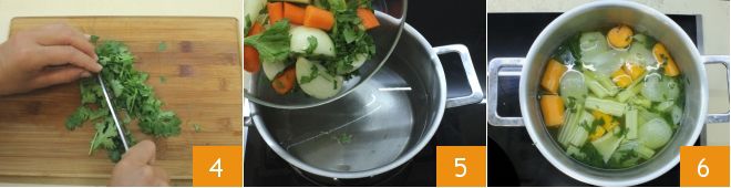 Enjuaga un manojo de cilantro fresco bajo agua corriente, colócalo sobre una tabla de cortar y pícalo 4, alternativamente puedes usar cilantro seco. En este punto, vierte las verduras en trozos y el cilantro fresco picado en el agua hirviendo 5 y deja cocer a fuego lento durante al menos 20-30 minutos 6. Deja que el caldo hierva a fuego lento, de modo que las verduras se cocinen lentamente y liberen su sabor.