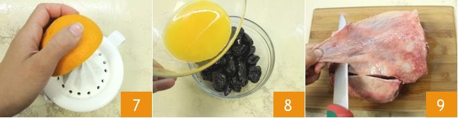 Mientras tanto, exprime las naranjas 7 y vierte el zumo obtenido sobre las ciruelas para la tajine de cordero 8. Deja marinar las ciruelas durante aproximadamente 1 hora, para que se rehidraten. El zumo de naranja le da a las ciruelas un toque ácido agradable, pero también puedes usar un zumo de manzana o de frutos rojos, lo importante es que sea sin pulpa y que combine bien con el sabor de las ciruelas. Ahora dedícate al corte de la carne de cordero: coloca la pierna de cordero sobre una tabla de cortar y elimina las partes grasas ayudándote con un cuchillo afilado 9.