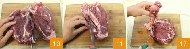 Luego divide la pierna por la mitad 10 y, siempre ayudándote con el cuchillo, rebana la carne alrededor del hueso 11, hasta extraerlo por completo 12.