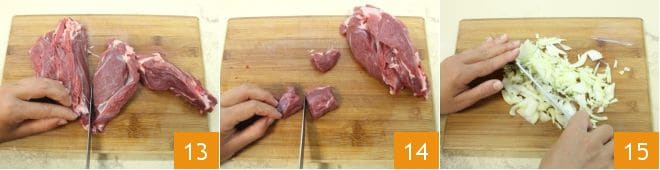 Divide la pulpa de cordero 13 y córtala en cubos regulares de aproximadamente 2 cm 14, para que la cocción sea más uniforme. Luego pela una cebolla y pícalo junto con los dos dientes de ajo pelados 15.