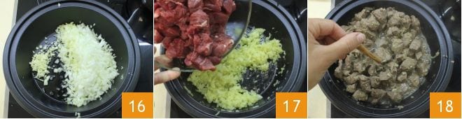 Toma la tajine, la cazuela de barro típica del norte de África, colócala sobre el fuego, vierte un chorrito de aceite y dora la mezcla de cebolla y ajo 16. Después de 2 minutos, añade la pulpa de cordero en cubos 17 y sofríe, mezclando con una cuchara. Añade una rama de canela 18.
