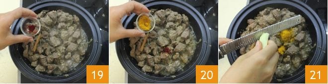 Añade también el azafrán 19, la cúrcuma 20 y finalmente ralla el jengibre fresco 21. Mezcla bien y deja freír todo durante 5 minutos con la tapa de la tajine.
