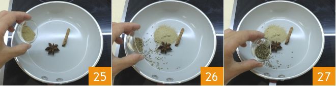 Mientras tanto, dedícate al cuscús: comienza tostando la mezcla de especias secas. En una sartén antiadherente, vierte el anís estrellado y una rama de canela, añade el cardamomo en polvo 25, las semillas de hinojo 26 y el comino 27.