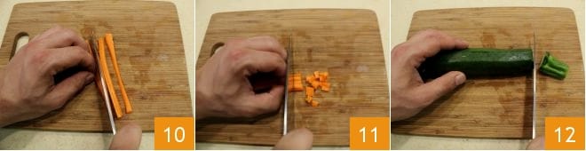 córtalas en tiras 10 y luego en cubos de aproximadamente 5 mm 11. Despunta los calabacines 12,