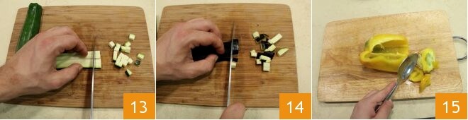 córtalos en cubos también de 5 mm 13 y luego repite la misma operación con las berenjenas 14. Toma los pimientos y elimina la parte superior, después con un cuchillo quita las semillas que se encuentran en el interior 15.