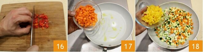 Reduce los pimientos en tiras no demasiado finas y luego en cubos de 5 mm 16. Cuando hayas limpiado todas las verduras, coloca en el fuego una sartén antiadherente amplia con un poco de aceite. Cocina las zanahorias durante 3 minutos 17 y luego añade los calabacines y los pimientos 18.