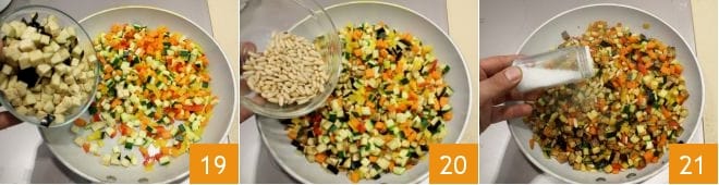 cocina durante otros 5 minutos y luego añade las berenjenas 19 junto con los piñones 20. Saltea durante otros 4-5 minutos. Cuando las verduras estén listas, añade sal y pimienta a tu gusto 21; apaga y reserva.