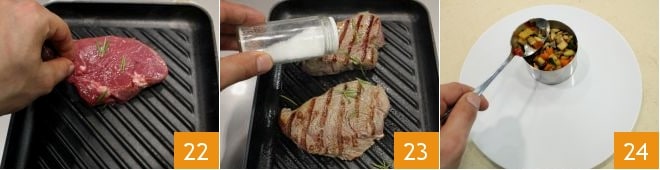 Una vez que la carne esté bien impregnada, dórela en una parrilla muy caliente 2-3 minutos por cada lado 22, de modo que quede tierna y rosada por dentro: dale la vuelta solo una vez con pinzas de cocina o espátulas para una cocción uniforme y al finalizar la cocción ajusta la sal 23. Cuando la carne esté lista, en un plato de servir dispón la caponata con la ayuda de un aro de emplatar de 10 cm de diámetro 24.