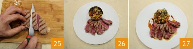 Corta la carne en 4-5 rodajas de 2 cm de grosor 25, colocándolas en el plato de servir 26; finaliza quitando el aro de emplatar y vertiendo sobre la carne un poco de reducción de salsa teriyaki y, si quieres, la punta de una ramita de romero: tu tagliata de ternera con reducción de salsa teriyaki y caponata está lista 24.
