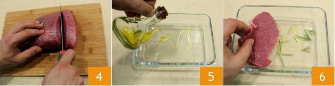 corta la carne en 4 piezas iguales de 130 g cada una 4. En una fuente aparte vierte 10 g de aceite 5, añade una parte de las agujas de romero y luego coloca la carne 6;