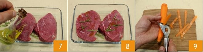 cubre todo con el aceite restante 7 y con las agujas de romero que has reservado, distribuyéndolas sobre la carne. Deja que la carne se impregne bien durante 5-10 minutos y mientras tanto prepara la caponata 8. Lava todas las verduras bajo abundante agua fresca corriente; limpia las zanahorias eliminando la piel 9,