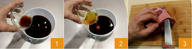 Para realizar la tagliata de ternera con reducción de salsa teriyaki y caponata, comienza con la preparación de la salsa. En un cazo vierte la salsa teriyaki 1 y la miel 2. Cocina a fuego muy bajo durante 30 minutos hasta que la salsa se haya reducido a la mitad. Mientras tanto, ocupa de la limpieza de la carne: con un cuchillo elimina la grasa y los nervios 3, luego