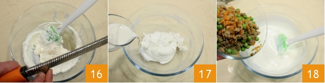 aromatizadla con nuez moscada 16, sazonad con sal y pimienta al gusto, luego añadid la leche 17 y mezclad los ingredientes antes de añadir el ragú blanco 18.