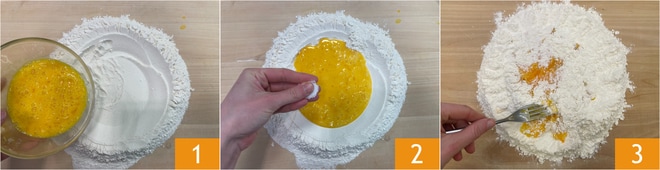 Para preparar los tallarines con ragú de corral, lo primero que hay que hacer es dedicarse a la masa: dispón la harina en forma de volcán y vierte en el centro los huevos ligeramente batidos 1. Añade una pizca de sal 2 y comienza a incorporar la harina con un tenedor 3.
