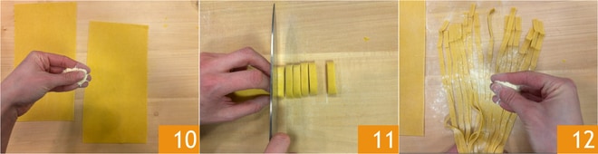 Espolvorea los rectángulos con más sémola 10 luego enróllalos y córtalos en tiras de aproximadamente 7-8 mm de grosor 11. Desenrolla los tallarines y espolvorea con más sémola 12.