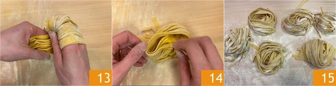 Enróllalos en la mano 13 para crear nidos 14 y déjalos reposar sobre la superficie de trabajo hasta el momento de su uso 15.