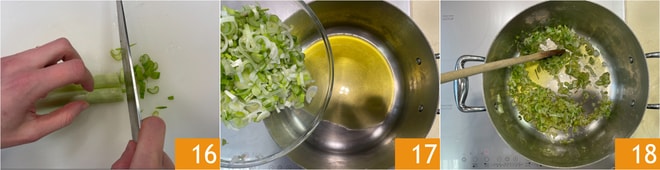 Dedícate ahora a la preparación del ragú: corta finamente los cebollines, incluida la parte verde 16. En una olla calienta un poco de aceite, añade los cebollines 17 y deja rehogar por 8 minutos a fuego medio. Cuando estén cocidos 18, retíralos de la olla y reserva.
