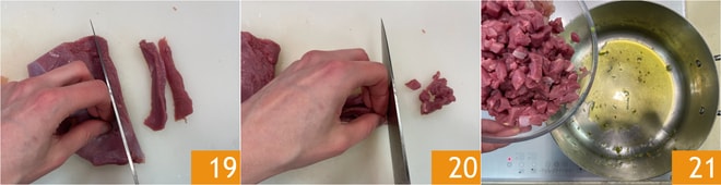 Corta a cuchillo la pechuga de pavo y de pato primero en tiras 19 y luego en cubos pequeños 20. En la misma olla donde cociste los cebollines calienta otro poco de aceite y añade la carne 21. Dora durante unos 10 minutos, a fuego alto, mezclando a menudo.