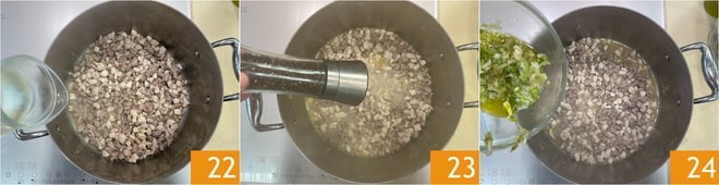 Desglasa con vino blanco 22 y raspa el fondo con una cuchara de madera, luego ajusta de sal y pimienta 23. Cuando toda la parte alcohólica se haya evaporado, añade los cebollines 24.