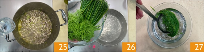 Vierte finalmente el agua 25 y cocina a fuego medio durante 20 minutos. Mientras tanto, dedica a la preparación de la salsa de hierbas: hierve el cebollino y el hinojo durante un minuto 26, luego escurre y enfría en agua con hielo 27.