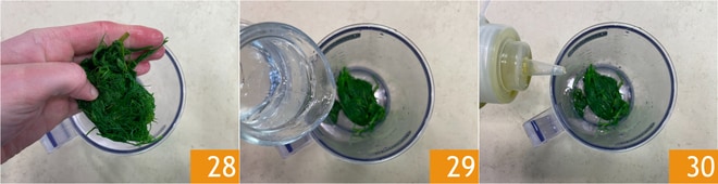 Escurre las hierbas y exprímelas bien, luego colócalas en un vaso 28 junto con el agua 29 y el aceite 30.