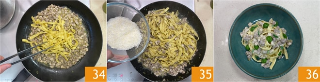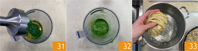 Tritura con una batidora de inmersión 31 hasta obtener una salsa lisa y homogénea 32. Cocina los tallarines en abundante agua hirviendo con sal durante 2-3 minutos 33.