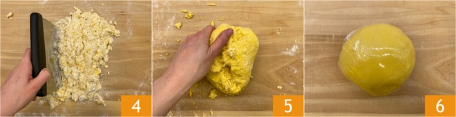 Amasa ayudándote primero con una espátula 4 y luego con las manos 5 hasta obtener un bollo liso y homogéneo. Envuelve en film 6 y deja reposar en el frigorífico al menos 20 minutos.