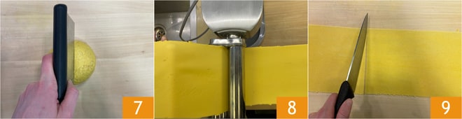 Retoma la masa y córtala por la mitad 7, luego estírala con una máquina de pasta comenzando desde el grosor más ancho 8, dando pliegues de refuerzo para los primeros giros, hasta obtener láminas de aproximadamente 2 mm de grosor. Espolvorea la superficie de trabajo con sémola y corta las láminas en rectángulos de 30 cm de longitud 9.