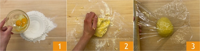 Para preparar las tagliatelle con flores de calabacín, como primer paso, en una tabla de amasar, disponed la harina en forma de volcán y verted dentro los huevos 1. Amasad 2 hasta obtener un bollo liso y homogéneo. Cubrid con film 3 y dejad reposar en el frigorífico durante 30 minutos.