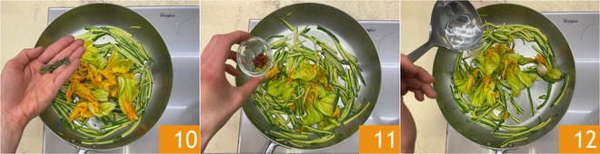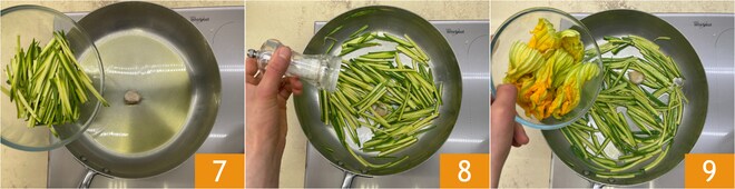 En una sartén verted un chorrito de aceite, añadid el ajo y los calabacines 7, ajustad de sal y pimienta 8 y saltead durante 2-3 minutos. Agregad entonces las flores de calabacín 9.