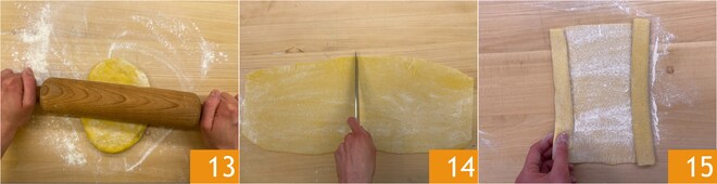 Retomad la masa y estiradla con un rodillo 13 hasta obtener una lámina de un espesor de aproximadamente 1-2 mm. Cortad la lámina por la mitad 14 y, empezando por los extremos, enrollad hacia el centro 15. Haced este procedimiento para cada lámina.